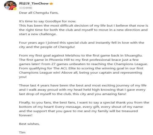 中超转会动态:周定洋发文告别成都蓉城,已与保级队完成签约